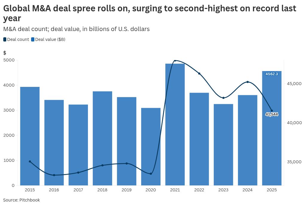 Despite a sluggish start as Trump’s sweeping tariffs early last year briefly scuttled acquisitions and new public listings, the total value of deal-making activity surged nearly 40% to a record of $4.9 trillion in 2025, according to private market intelligence firm Pitchbook.