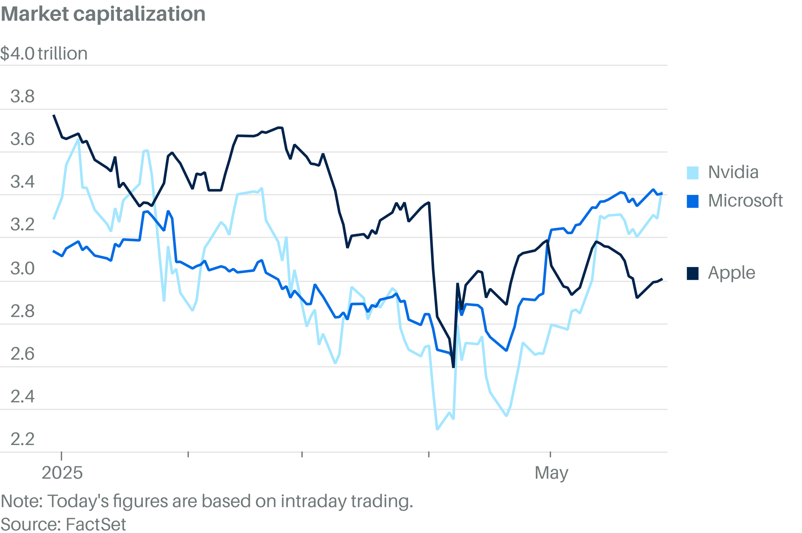Nvidia now has a market cap of $3.409 trillion in Thursday intraday trading, according to Dow Jones Market Data. That puts the AI chip maker above Microsoft, which has a market cap of $3.404 trillion.