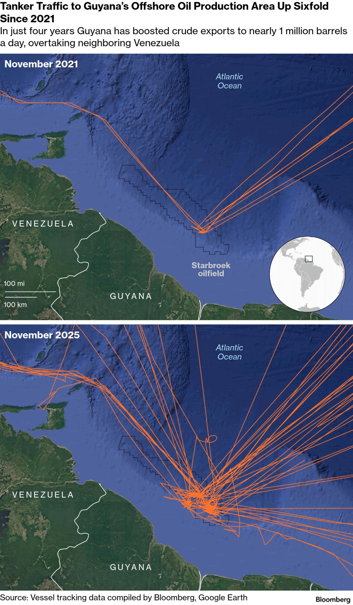 Source: Vessel tracking data compiled by Bloomberg, Google Earth