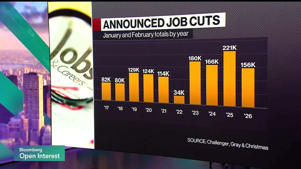 Andrew Challenger, chief revenue officer at Challenger, Gray & Christmas, examines the firm’s job cut announcement data for February, which saw a sharp year-over-year decrease. (Source: Bloomberg)